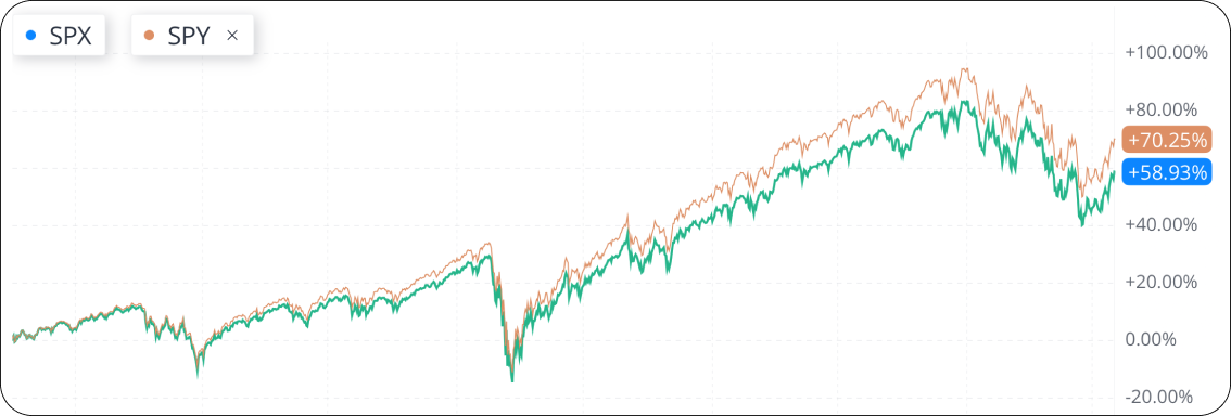 • For example, $Spdr S&P 500 Etf tracks the S&P 500 Index (SPX) by holding all members of the underlying index at their target weights. Its share price is intended to be 1/10th of the index. As we can see below, the price changes of the two have been highly consistent over the last 4 years (July 2018 to July 2022).