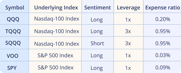 2. While 1x ETFs seek 100% exposure to indexes, leveraged ETFs seek a few times the exposure. Do not play with leverage until you’re ready.