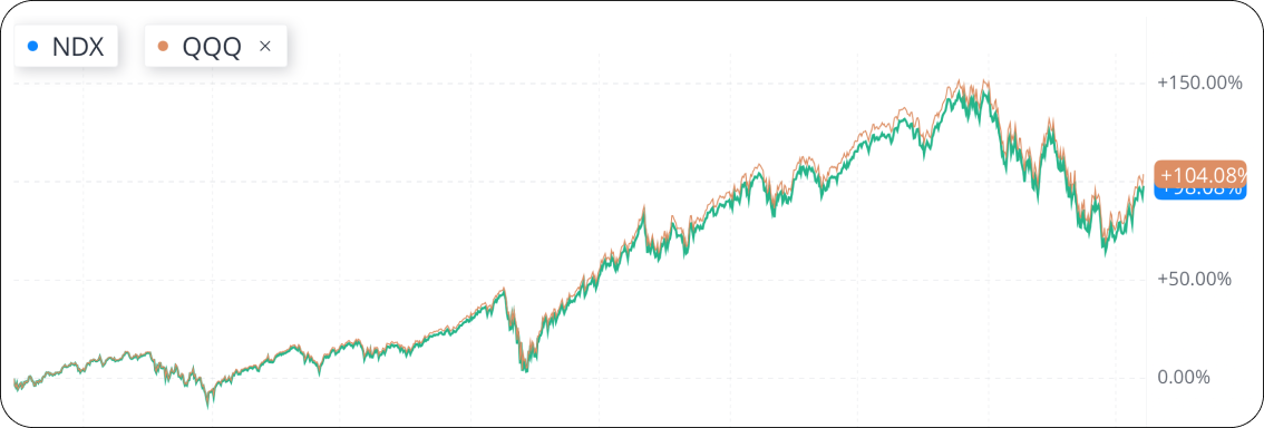 • Among multiple ETFs that track Nasdaq indexes, the most famous one is $Invesco QQQ Trust. It tracks the Nasdaq-100 Index (NDX), which comprises 100 of the largest non-financial companies included in the Nasdaq Composite Index. It currently trades at approximately 1/40th of the value of the NASDAQ-100 Index. Over the last 4 years (July 2018 to July 2022), QQQ has closely followed the movements of the Nasdaq-100 Index.