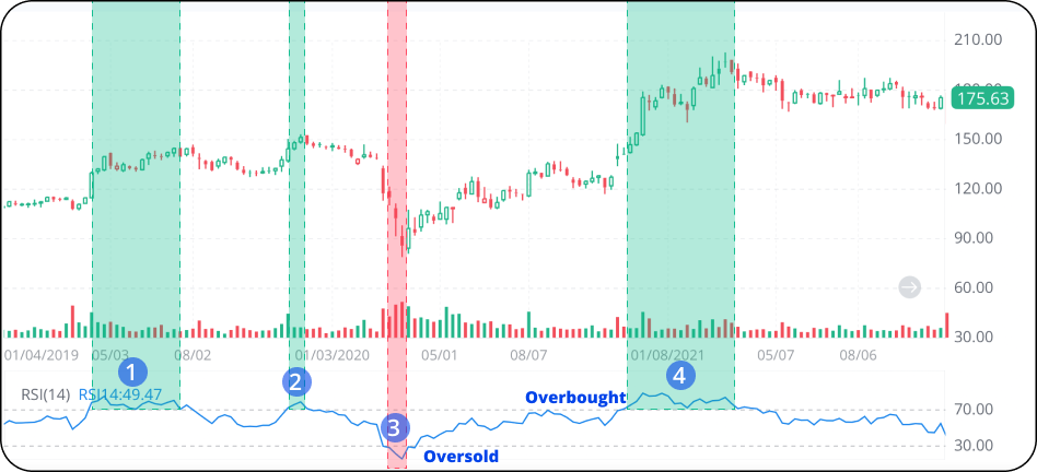 As we can see below, in periods 1, 2, and 4, the RSI has reached above 70 and stayed in the overbought area, which indicates that the upside momentum is strong. Correspondingly, we can see a sharp increase in the price chart (especially in period 4). Investors may want to sell the asset at the end of overbought periods. This is because when the RSI falls back below 70, the upside momentum weakens, and a reversal may occur.