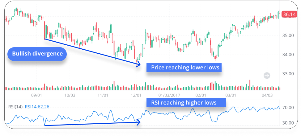 When the RSI reaches higher lows while the asset price is making lower lows, a bullish divergence is formed. It indicates that despite the price still falling, the downside momentum is weakened. A reversal might be on the way.