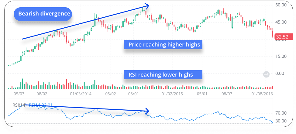 When the RSI hits lower highs while the asset price is making higher highs, a bearish divergence is formed. It indicates the upside momentum is weakened. Investors might need to look out for a downtrend.