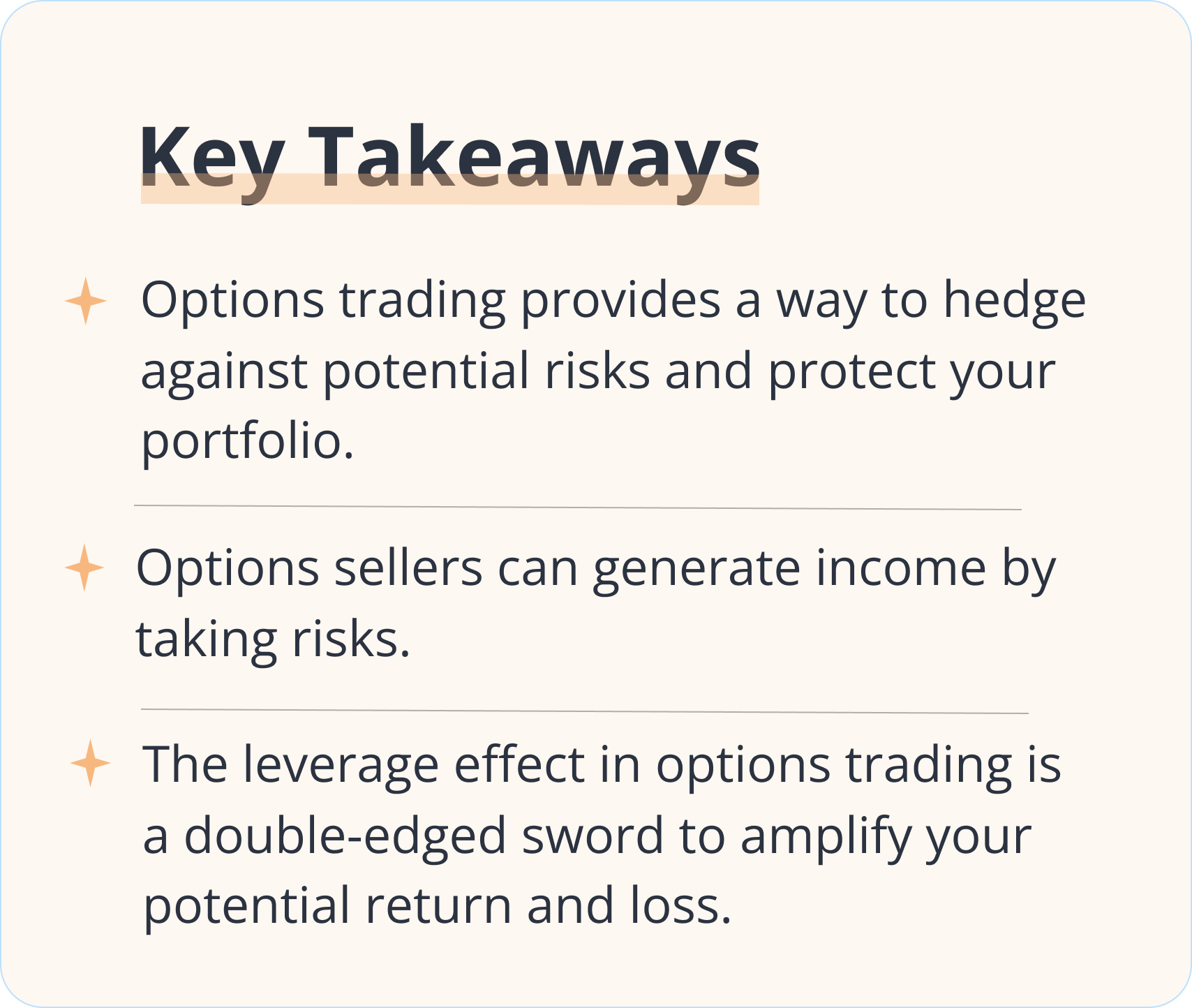 The leverage effect in options trading is a double-edged sword. It provides a cost-efficient way to establish positions with great leveraging power.